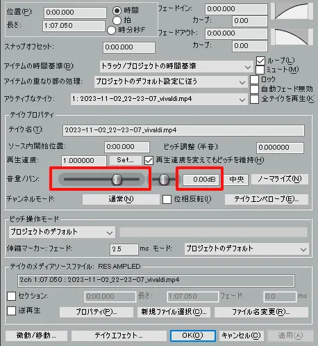 あるいは、アイテムプロパティ(F2)から音量を変更する事も出来ます